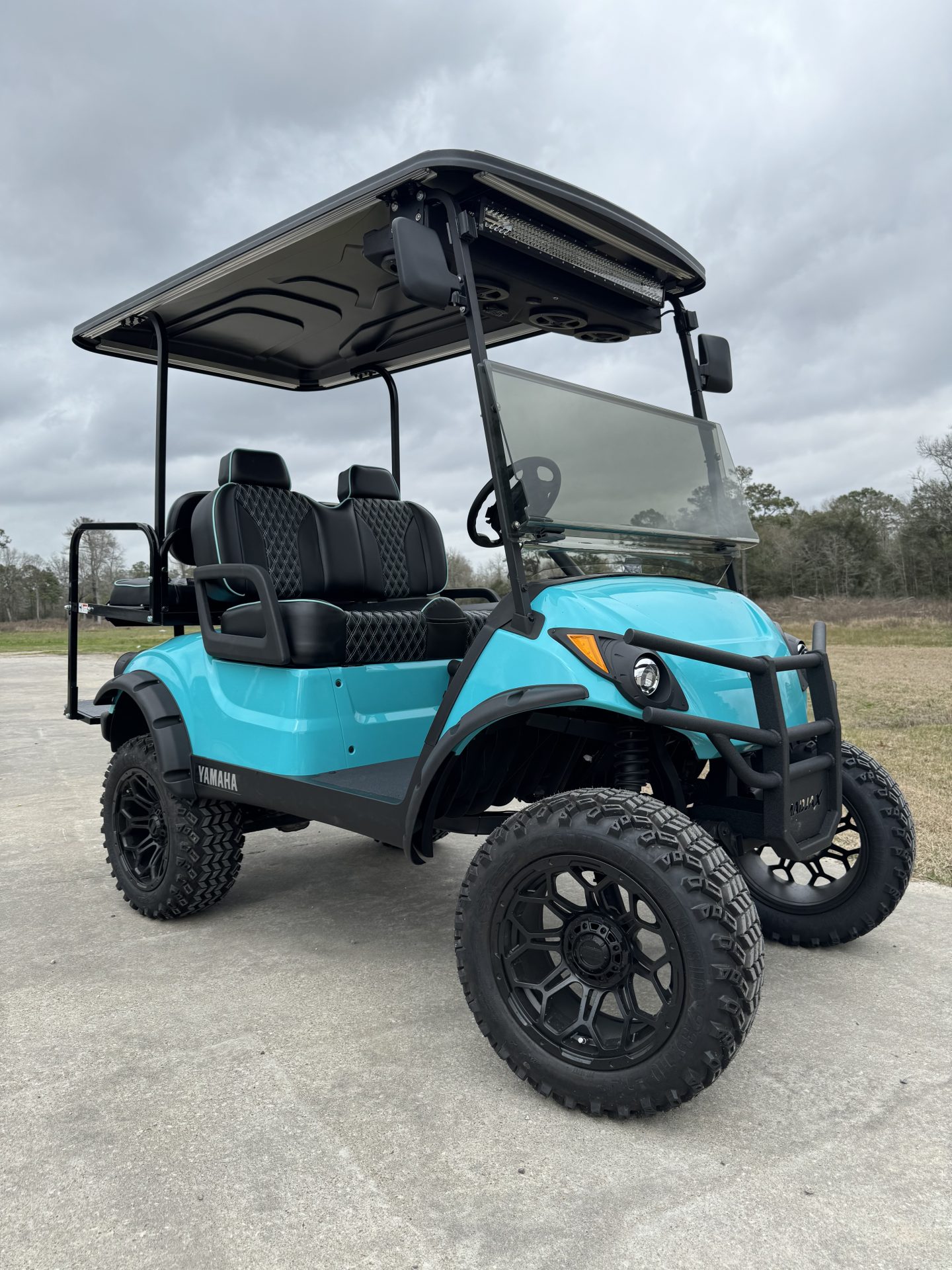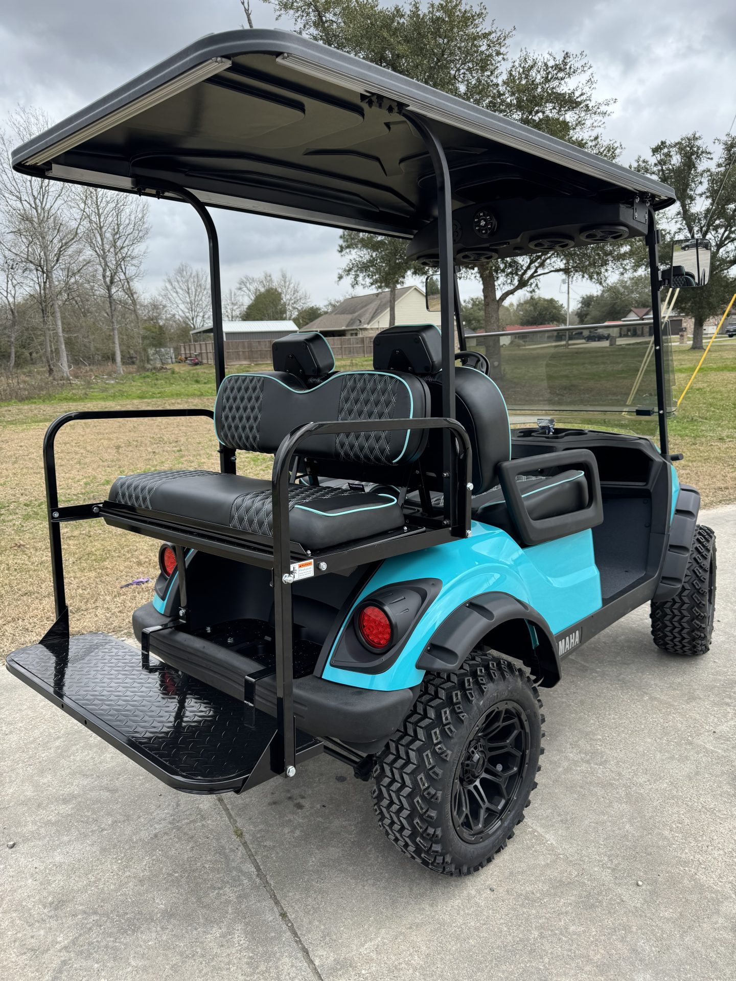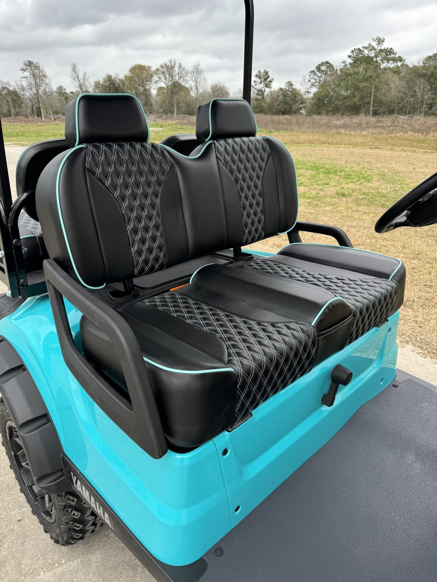 - Custom luxury black stitched seats with sky blue trim